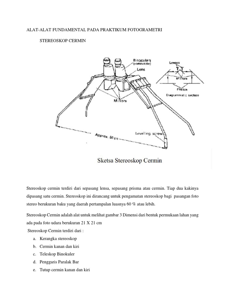 Disamping itu untuk menunjuk titik bayangan obyek di foto kiri dan kanan pada tongkat ini juga. Stereoskop Cermin pada dasarnya adalah sebuah alat yang di rancang khusus untuk dapat melihat suatu obyek yang awalnya berbentuk 2D menjadi 3D dengan cara cermin menerapkan sistem fusi dua gambar.